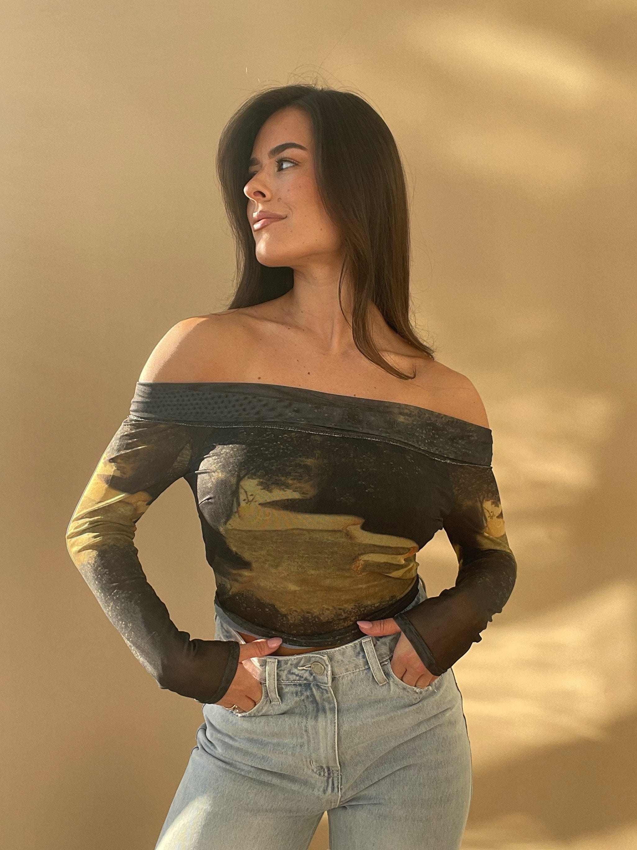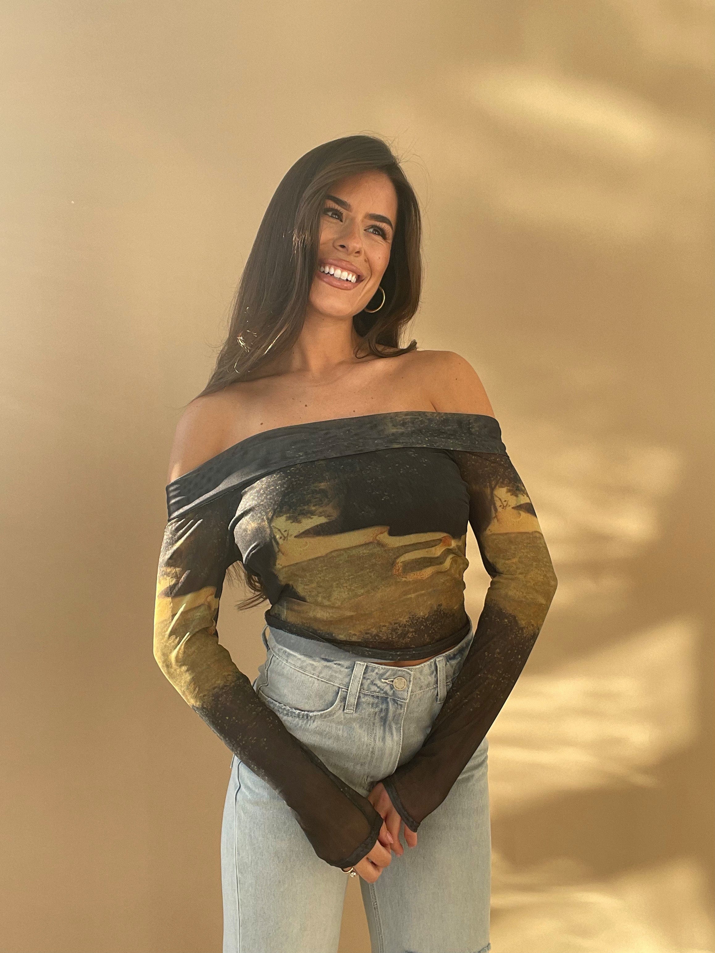 The With The Vibes Top is a versatile addition to any wardrobe. Made with stretchy fabric, it offers a comfortable fit and flattering drape. The sheer fabric on the arms adds a touch of elegance, while the off shoulder design and unique marble print are sure to turn heads. Elevate your style with this trendy and eye-catching top.