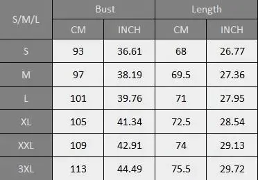 ["Black\u00b7S: Bust 36.61\"\/93cm","Black\u00b7M: Bust 38.19\"\/97cm","Black\u00b7L: Bust 39.76\"\/101cm","Black\u00b7XL: Bust 41.34\"\/105cm","Black\u00b7XXL: Bust 42.91\"\/109cm","Black\u00b73XL: Bust 44.49\"\/113cm","Yellow\u00b7S: Bust 36.61\"\/93cm","Yellow\u00b7M: Bust 38.19\"\/97cm","Yellow\u00b7L: Bust 39.76\"\/101cm","Yellow\u00b7XL: Bust 41.34\"\/105cm","Yellow\u00b7XXL: Bust 42.91\"\/109cm","Yellow\u00b73XL: Bust 44.49\"\/113cm"]