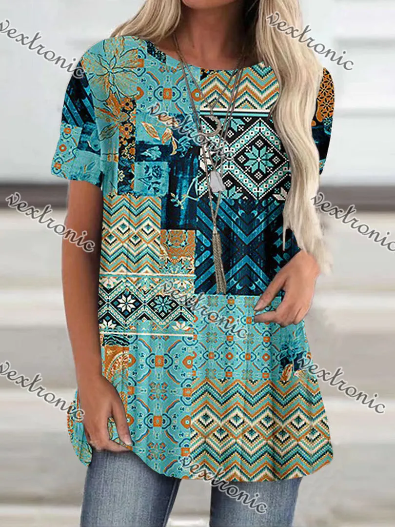 Women Short Sleeve Scoop Neck Floral Printed Graphic Geometric Tops