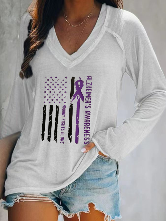 Women'S Alzheimer'S Awareness Nobody Fights Alone V-Neck T-Shirt 9552166