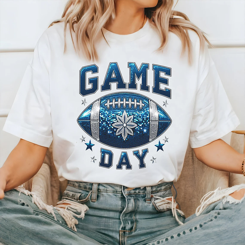 Women's Football Game Day Print Round Neck Short Sleeved T-shirt