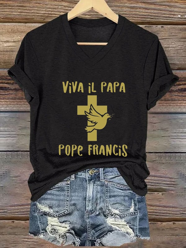 Women's Viva Il Papa 1936-2025 Print Short Sleeve V-Neck Cotton T-Shirt