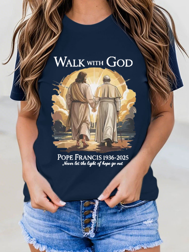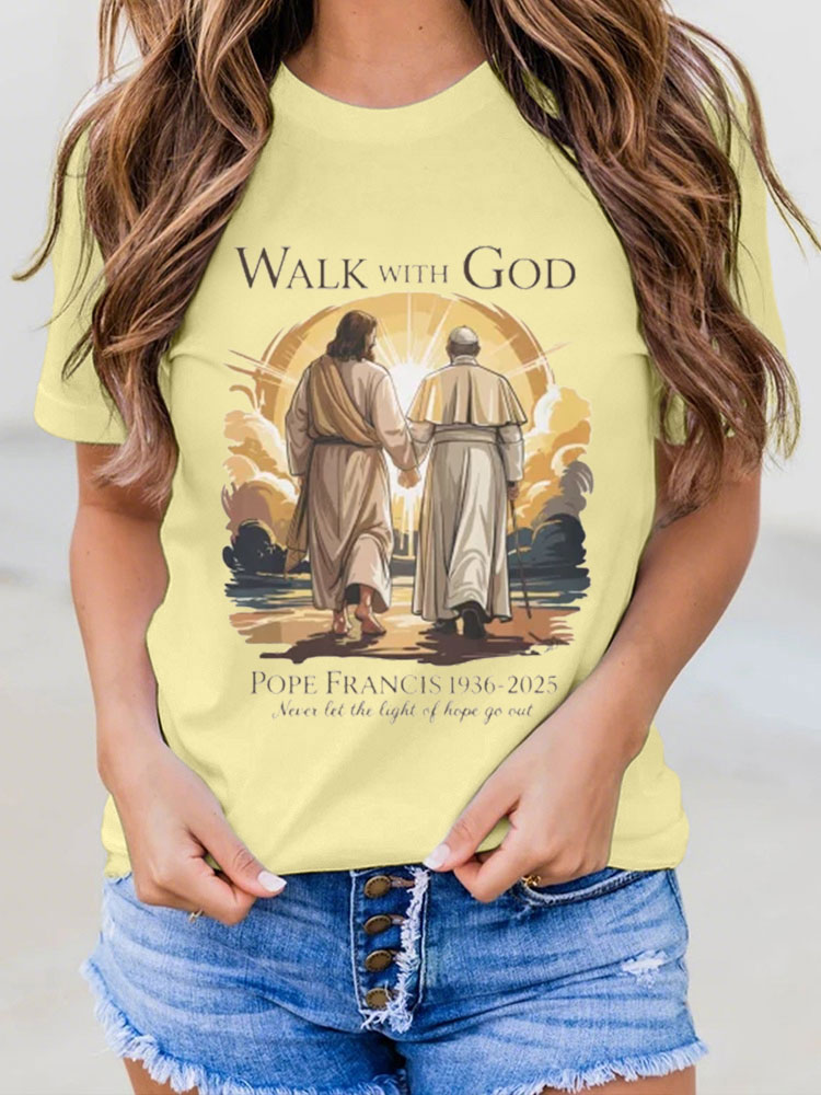 Women's Walk With God Print Short Sleeve Round Neck Cotton T-Shirt