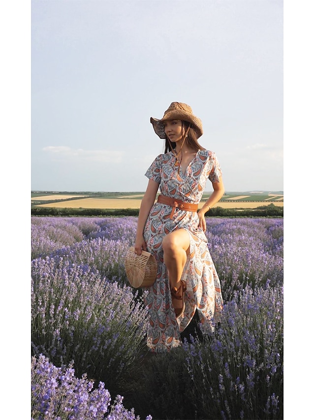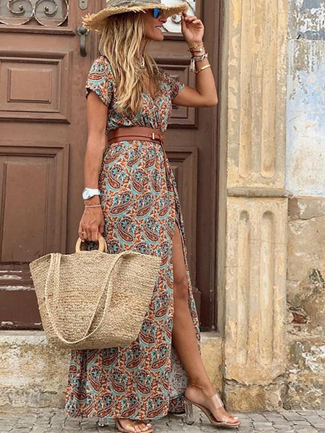 1. Bohemian long dress with a unique V-neck and geometric pattern design.