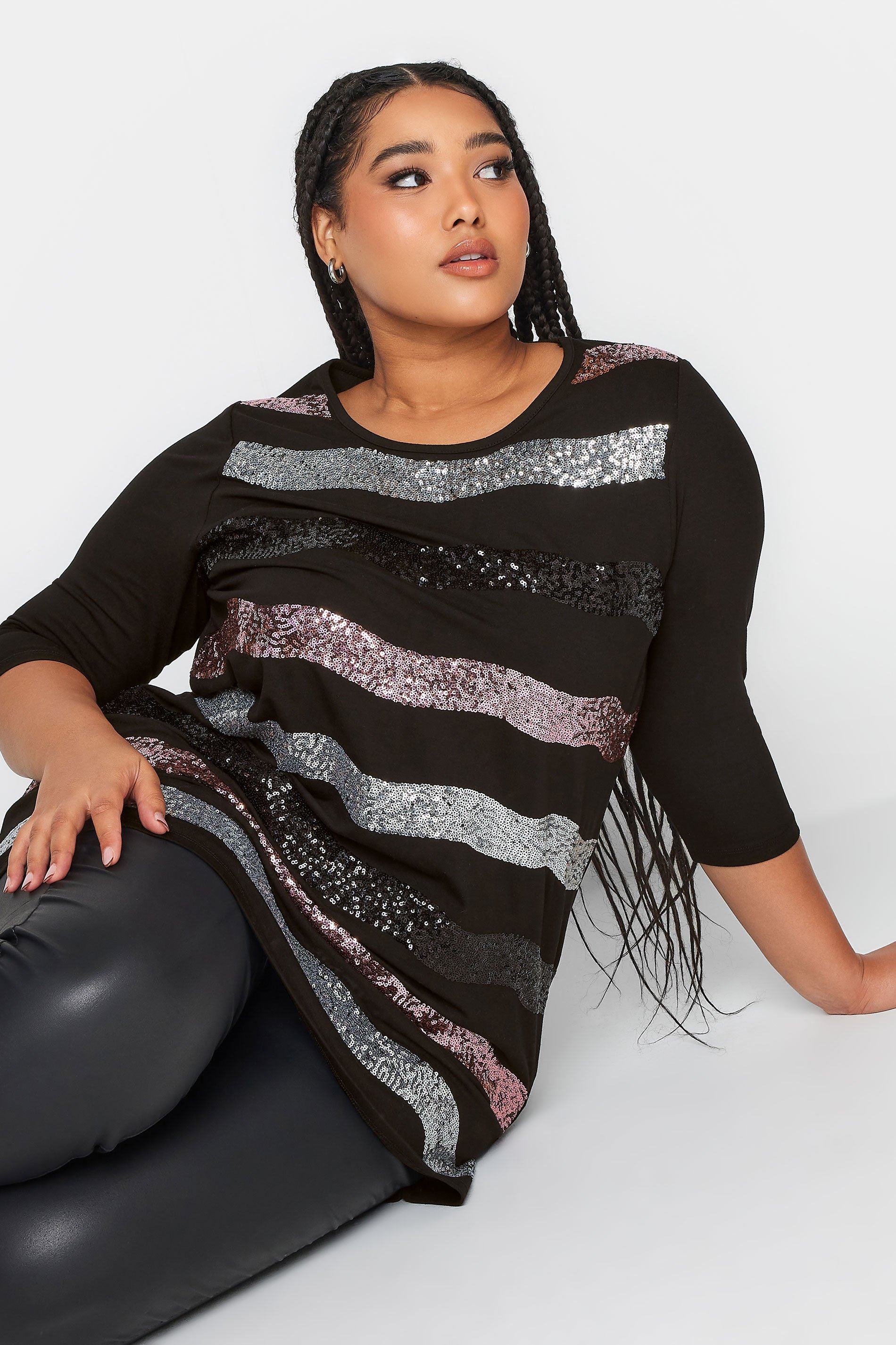 YOURS Curve Black Sequin Embellished Stripe Top 251797