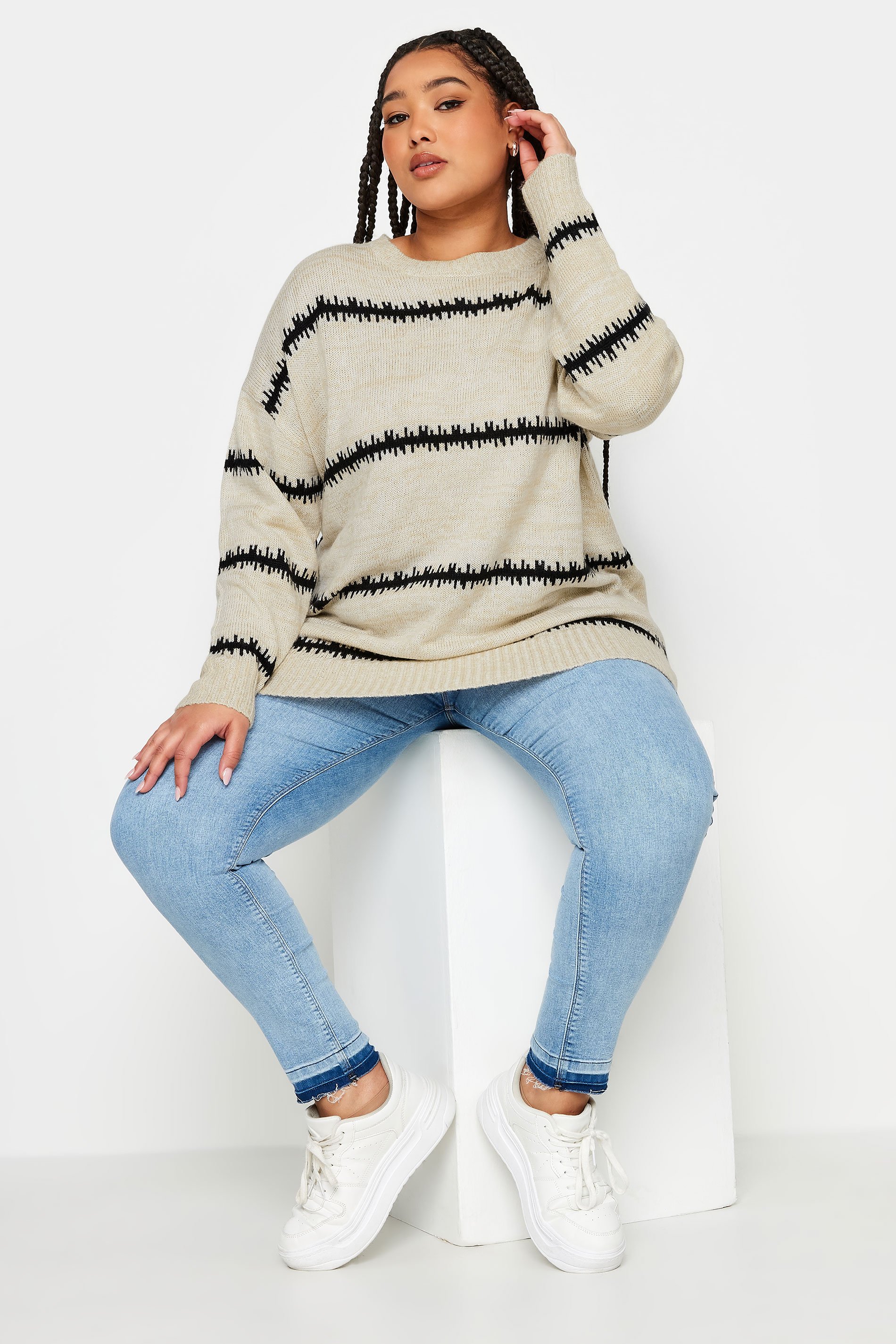 Your new favourite jumper! Made from a soft knitted fabric, this jumper features a feathered, striped design, a scoop neckline and long sleeves. Pair with jeans and boots for a cool, cosy look this winter.