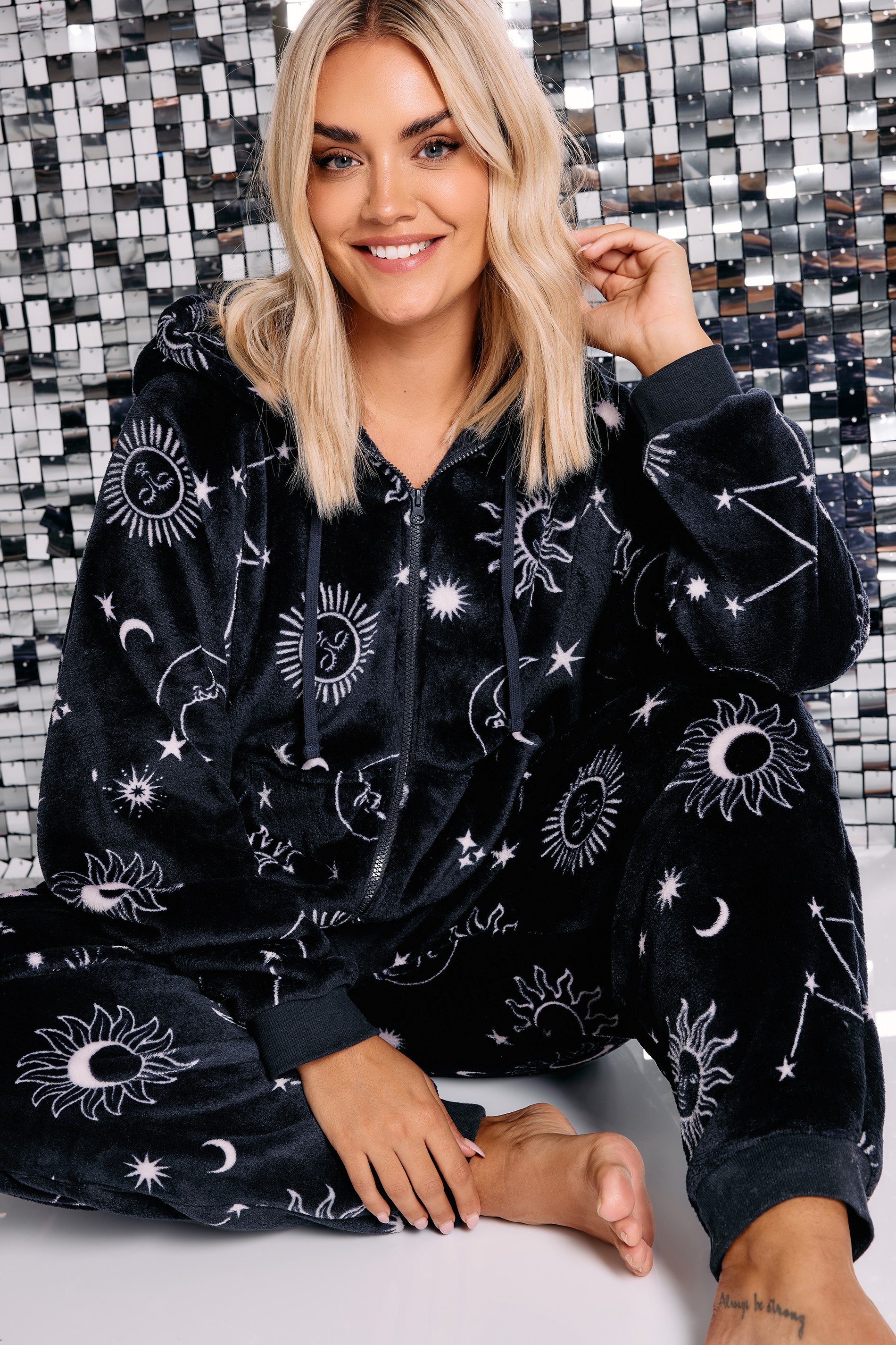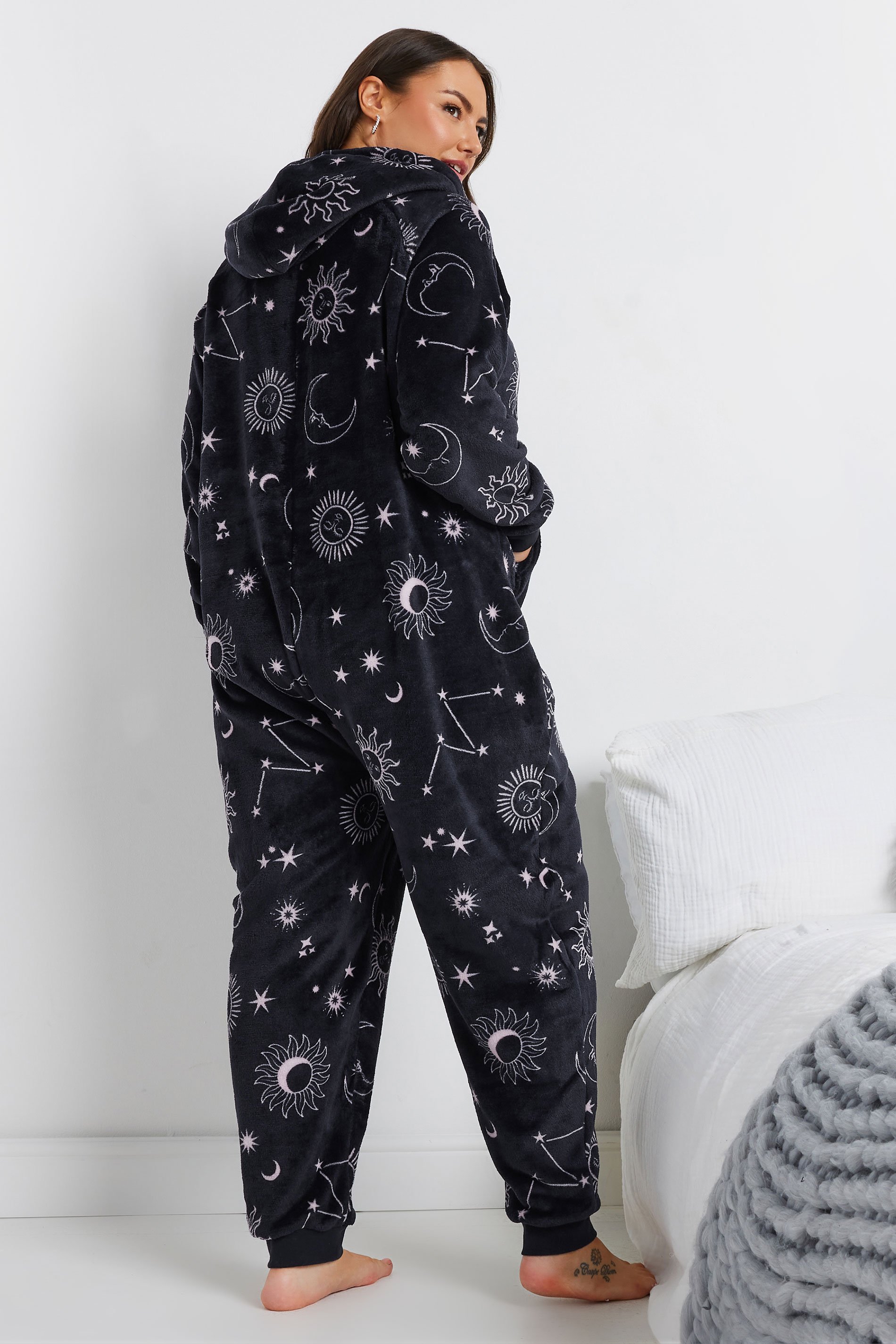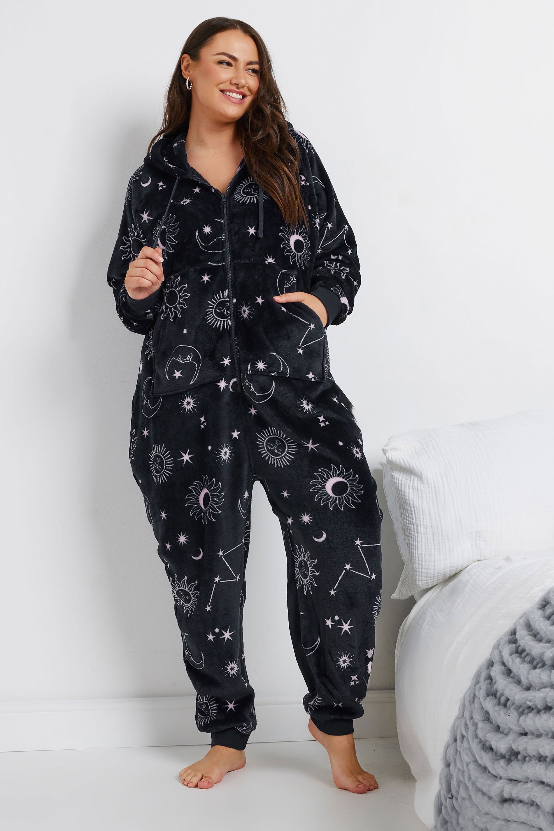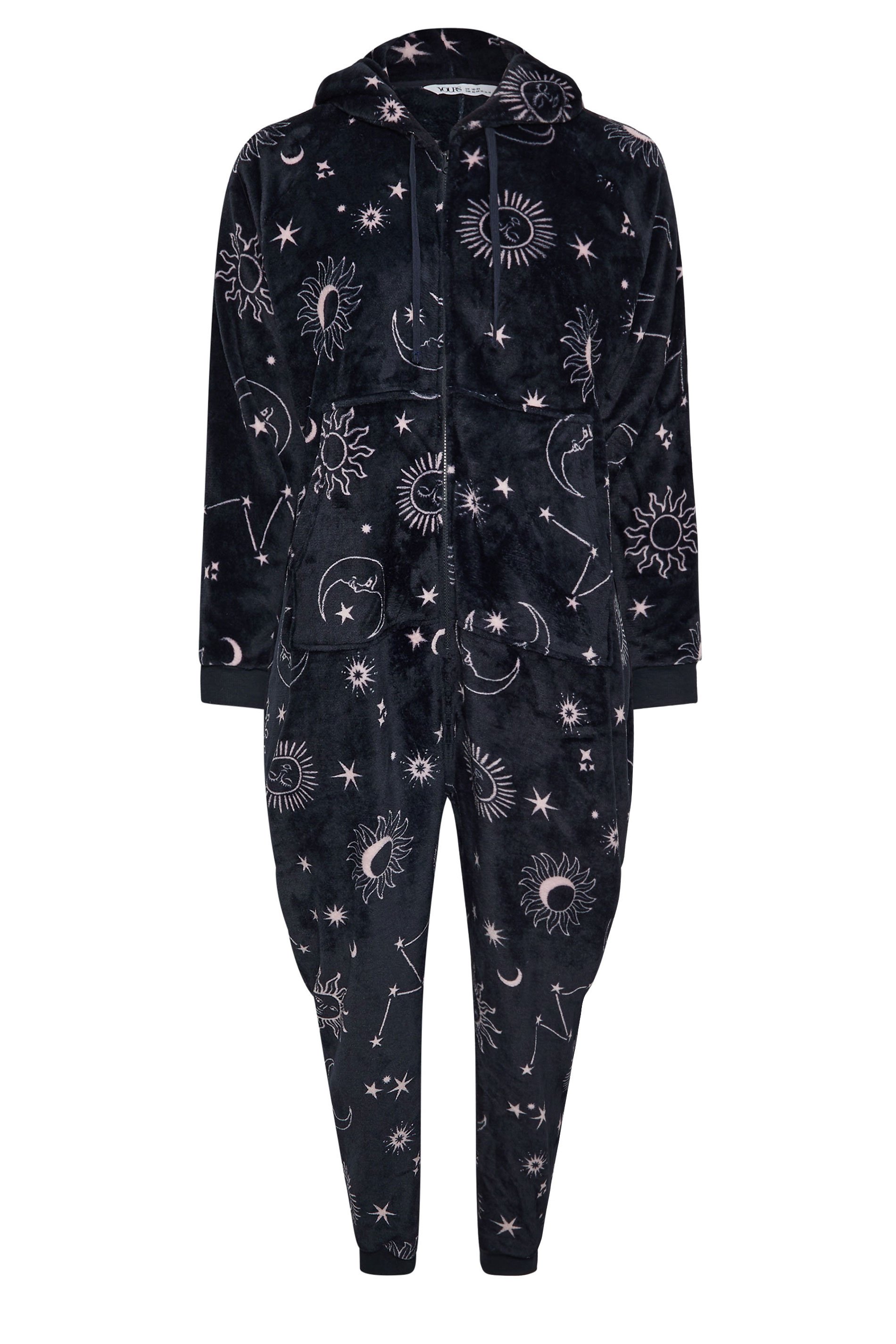 Stay warm and cosy this season with this must-have onsie! Made from a super soft fabric, it features a celestial print, long sleeves, a hooded design with adjustable drawstrings, a cuffed style, two front pockets, and a zip through fastening! Pair with your favourite slippers for a look you will be wearing on repeat in the colder weather!