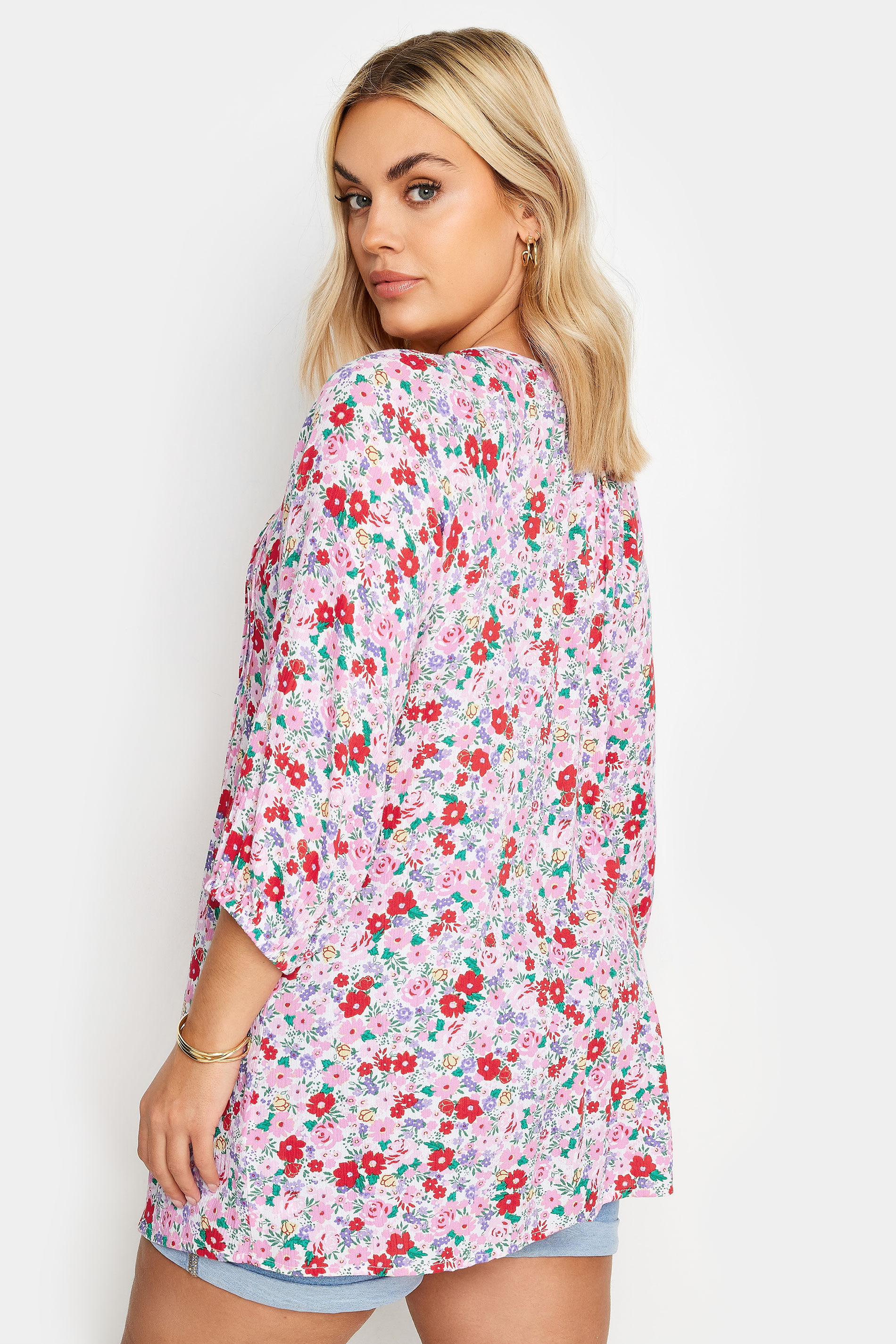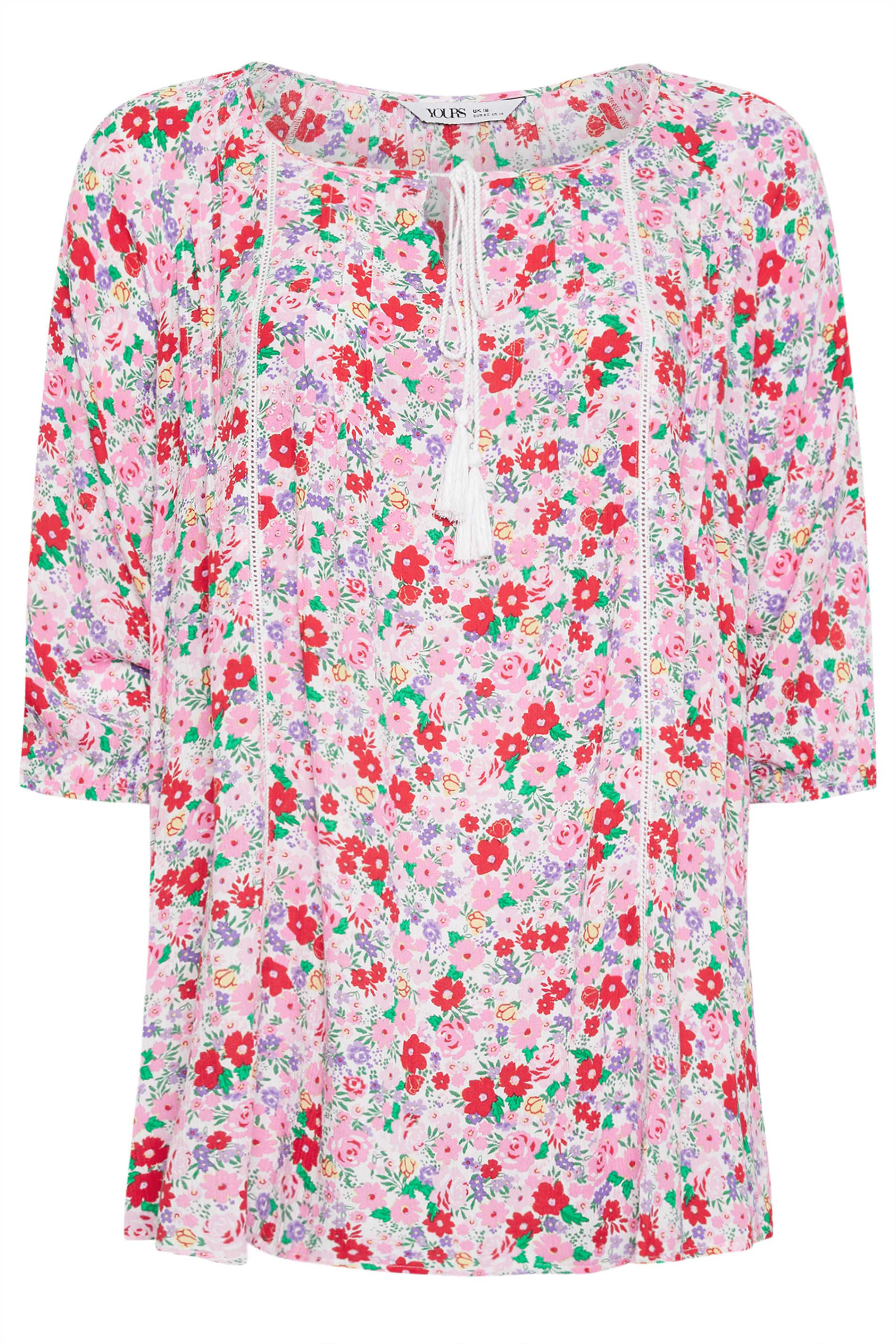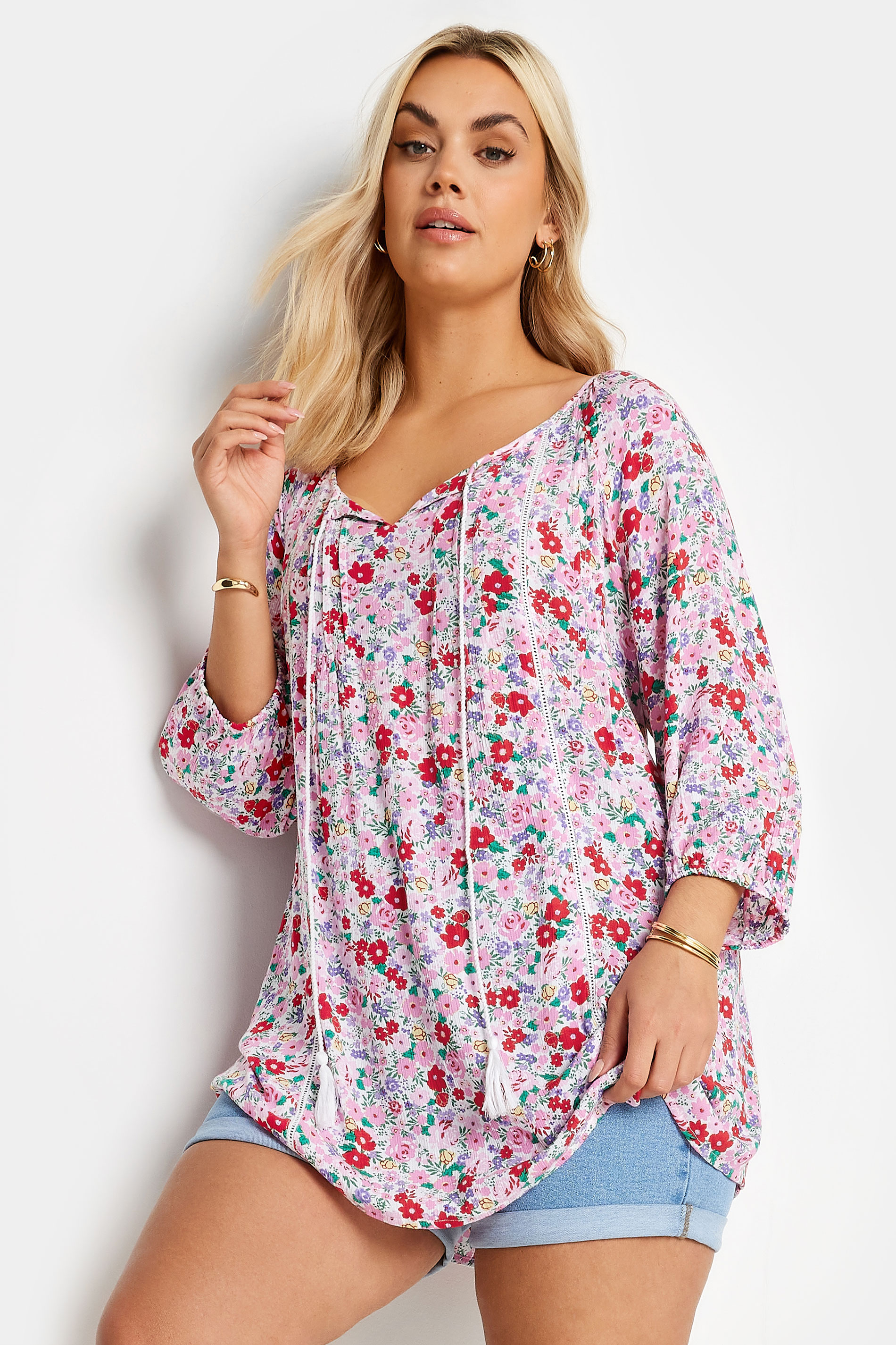 • YOURS Curve Pink Floral Print Tie Neck Boho Blouse