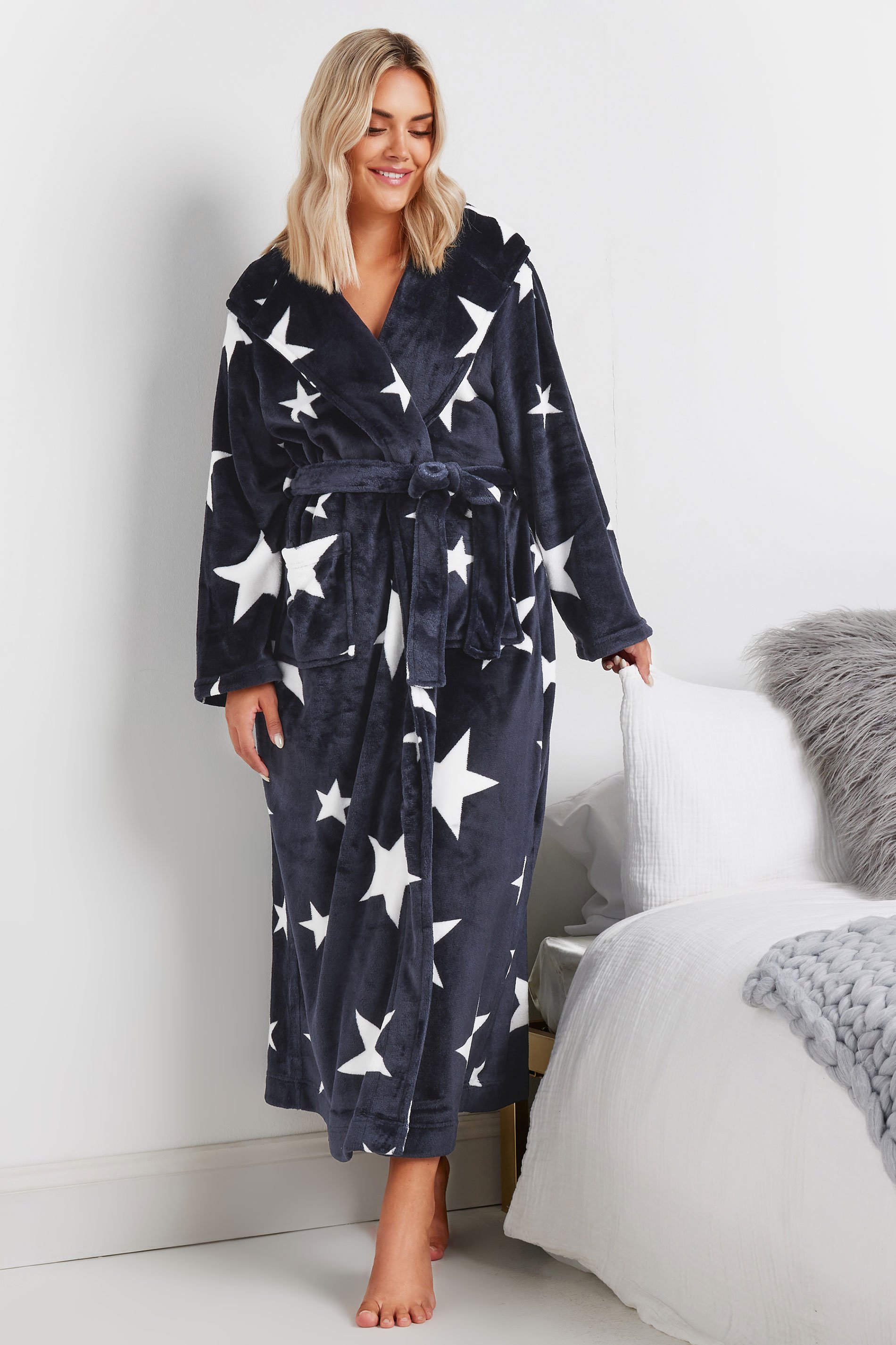 Stay warm and cosy as you sleep this season with this new-in dressing gown! Made from a soft touch fabric, it features a star print design, a maxi length, front pockets, and a belt fastening. Pair with your favourite pyjamas for a cosy night in look.