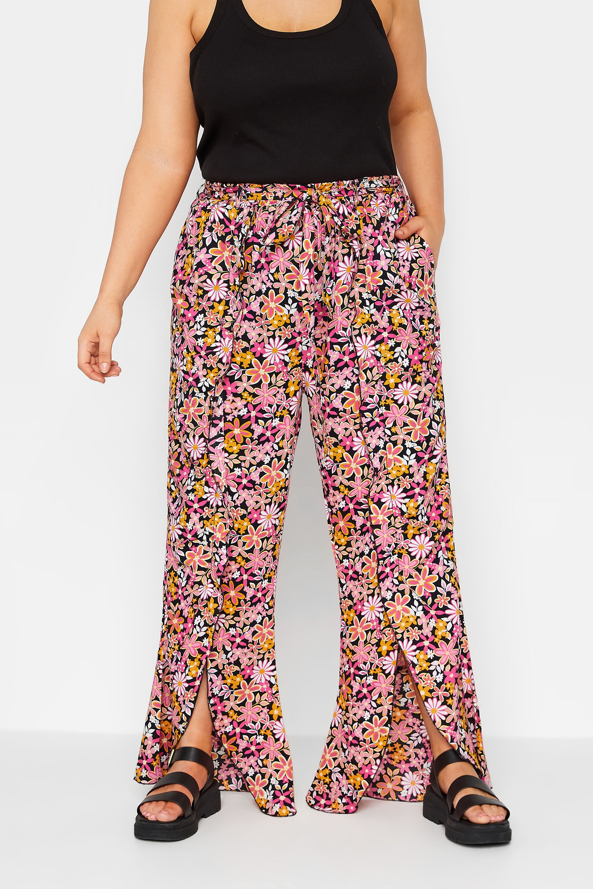 YOURS Curve Pink Floral Print Frill Wide Leg Trousers 258112