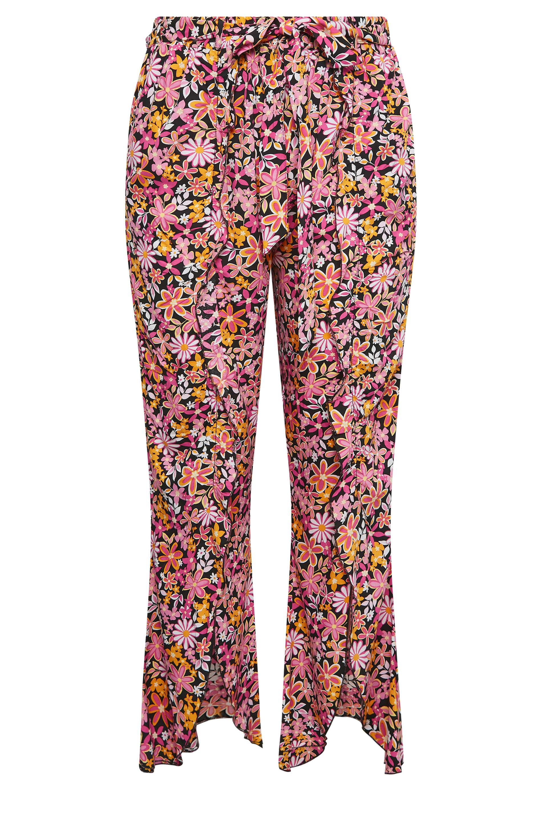 YOURS Curve Pink Floral Print Frill Wide Leg Trousers