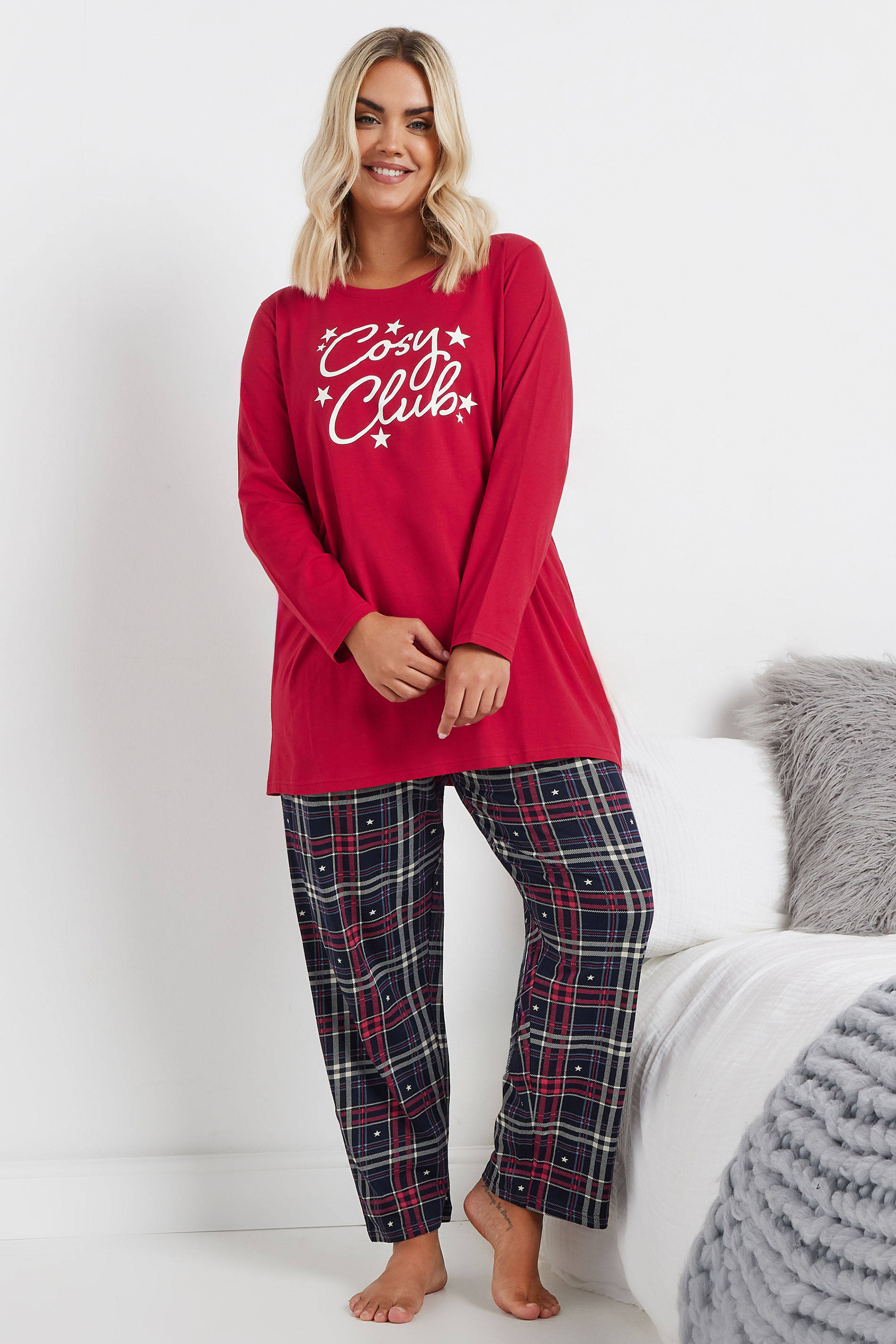These stylish pyjamas are perfect for gifting this festive season! Made from a pure cotton fabric, they feature a 'Cosy Club' slogan print, a check print design, long sleeves, and wide leg trousers with an elasticated waistband. Simply pair with your favourite slippers for your next cosy night in!
