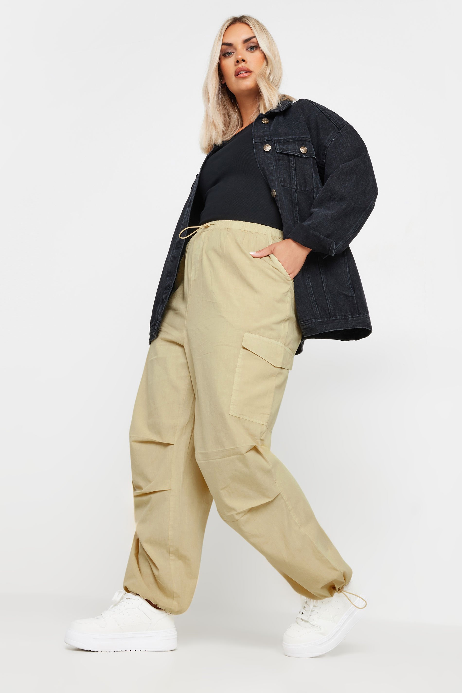 Stay on trend with the new in plus size parachute trousers! Made from a comfortable cotton fabric, these trousers feature pockets, a high waist, and drawstrings finished in a parachute style. Wear with a tee and trainers for a comfortable everyday look.