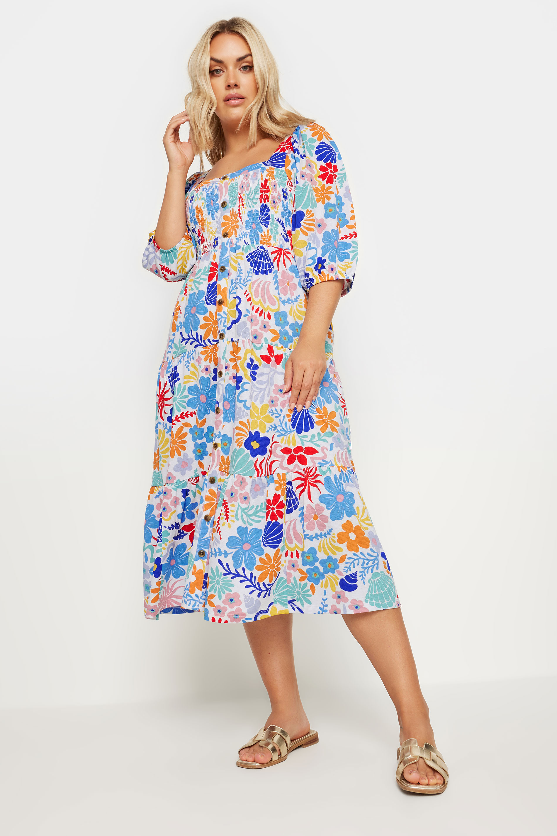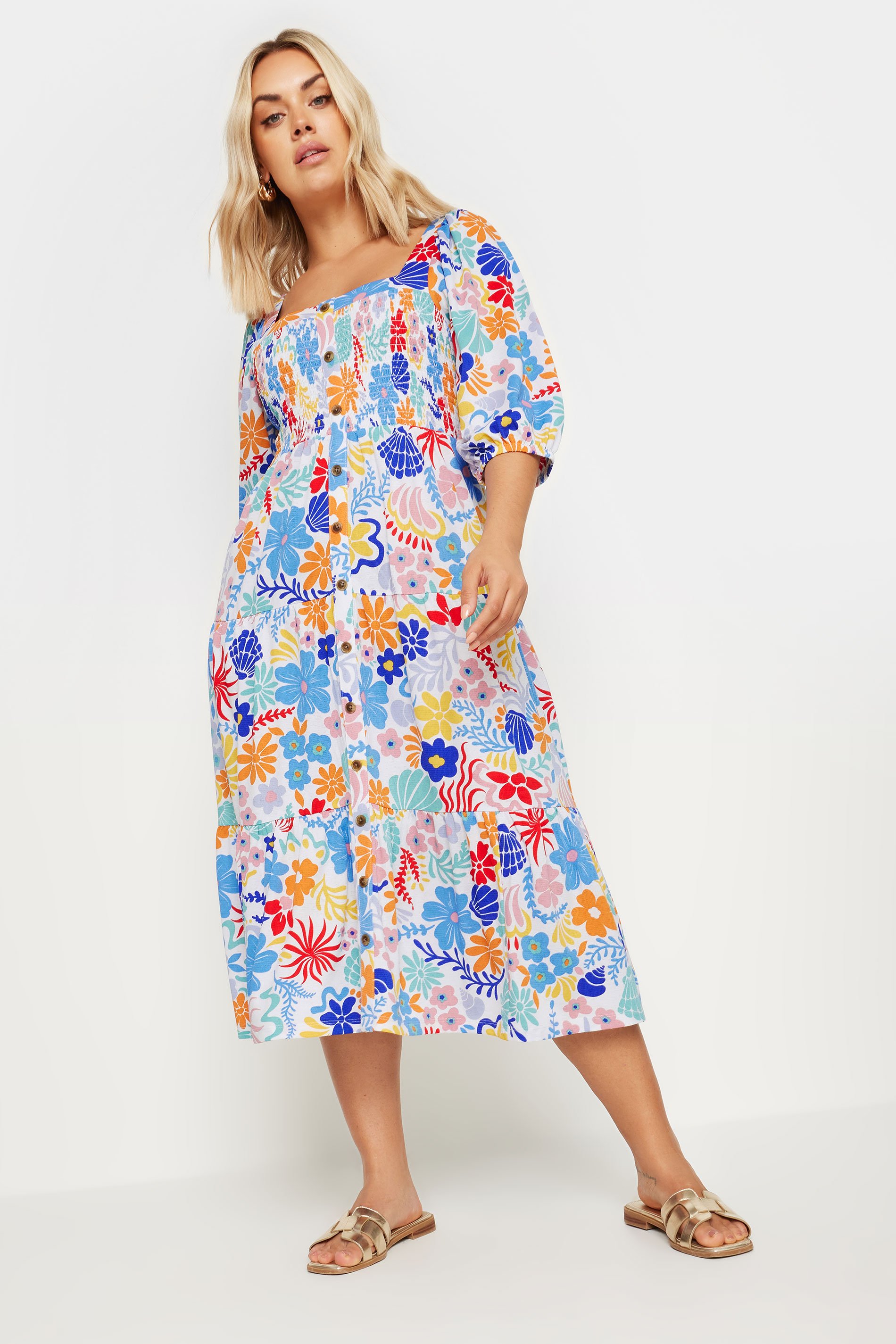 Welcome this must-have midi dress to your summer collection. Made from a comfortable woven fabric, this dress features a tiered style skirt, button front detailing, puff style sleeves, a shirred front and a squared neckline. Style with sandals and your favourite sunglasses for an effortless look you'll love.