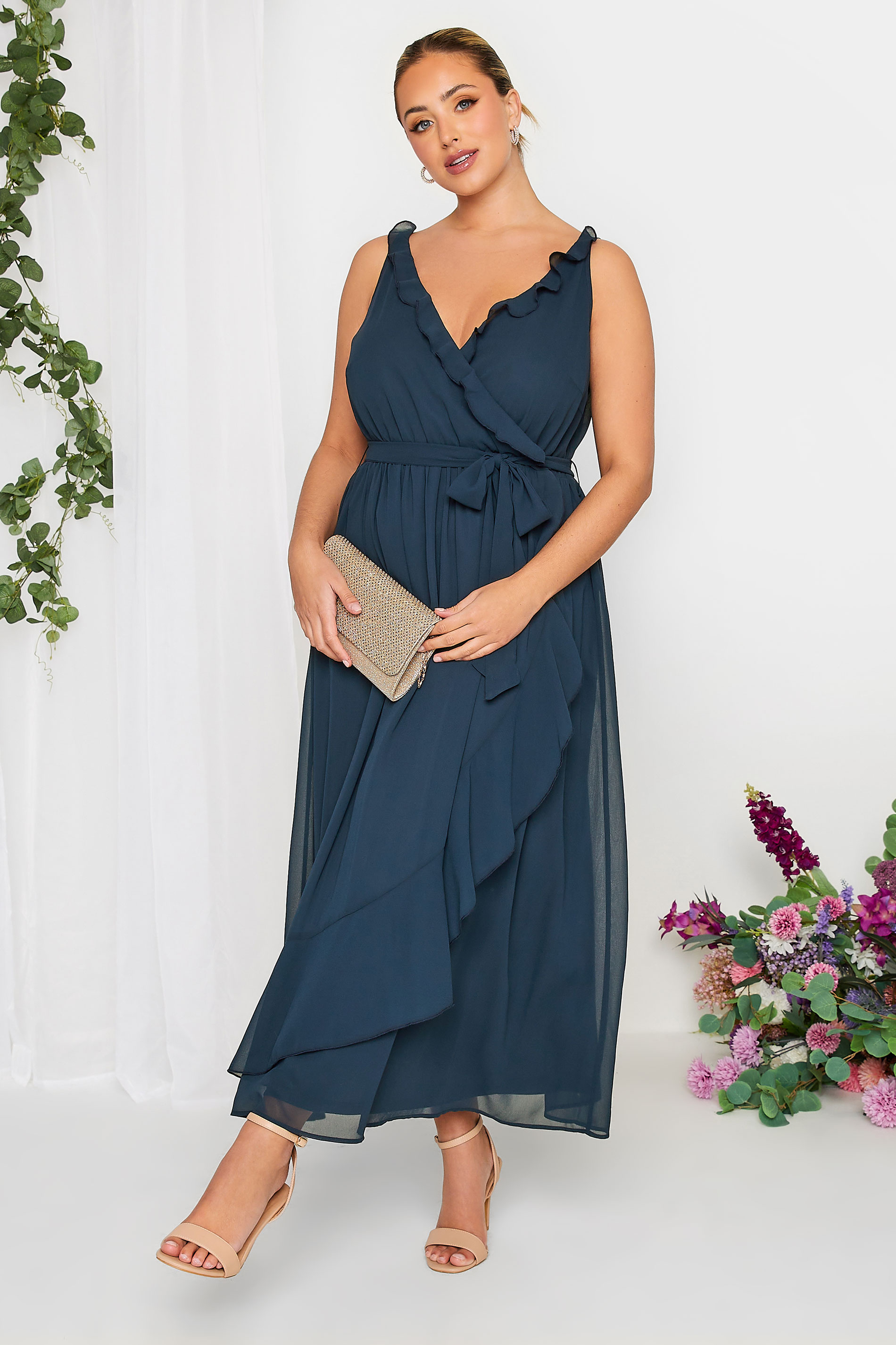 This Yours London ruffle wrap dress is a must-have for bridesmaids or wedding guests. Made from a soft woven fabric, it features adjustable straps, a ruffle v-neckline and in a wrap style and finishes in a maxi length. Style with your favourite heels and clutch bag for a outfit you feel your best in.