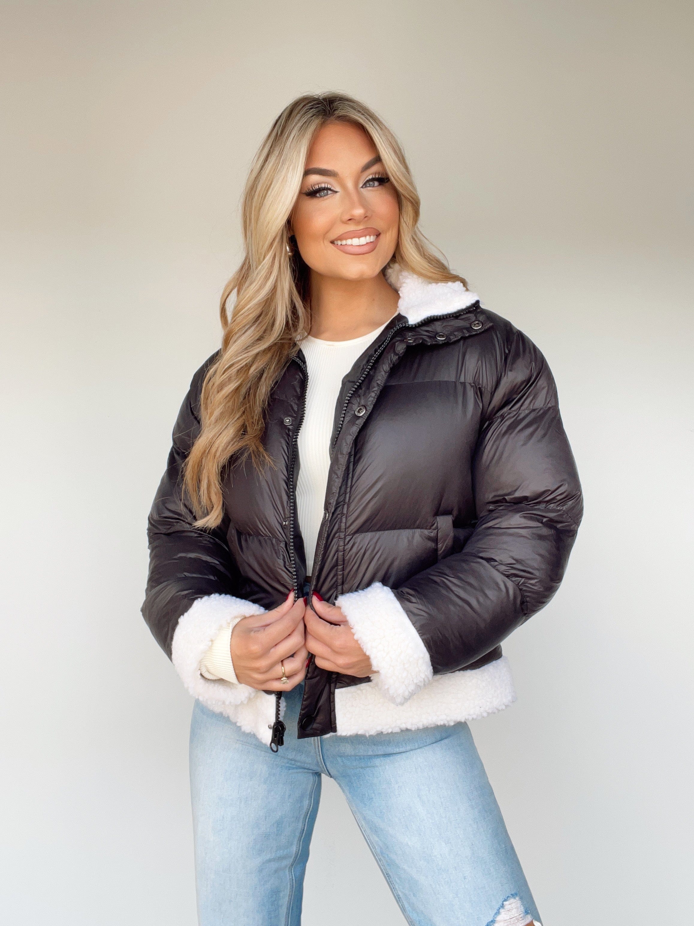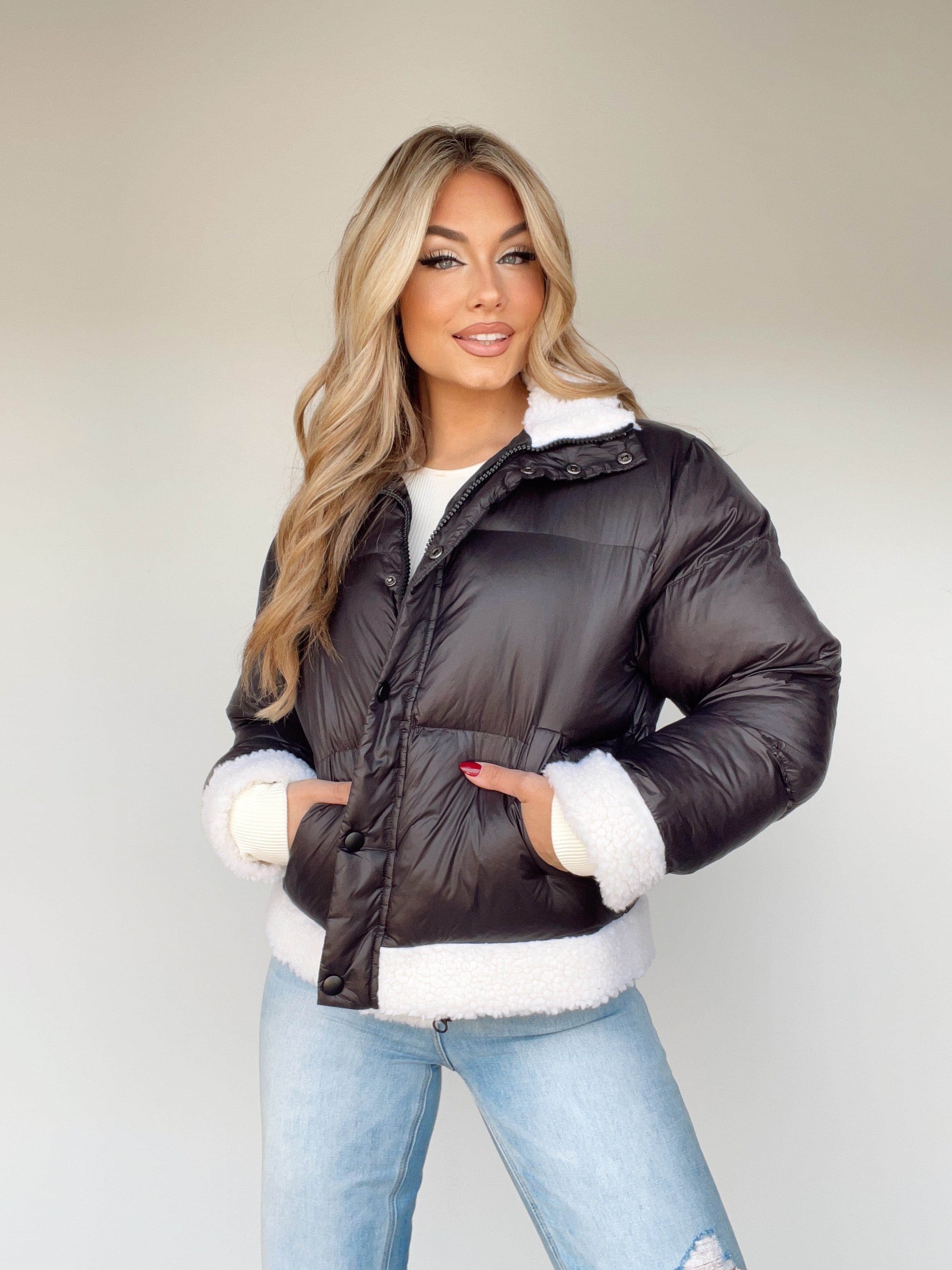 Embrace the chilly season in style with the Zero Chill Puffer Coat. Featuring elegant sherpa collar and hem details, a collared neckline, and button closures, this puffer coat is matte, warm, and cozy-perfect for taking on the day in comfort and style. The Zero Chill Puffer Coat is a trendy and edgy piece that will make an elevated statement, transitioning easily from a hot cocoa at the hockey game to a hot girl walk and shopping. With pocket details and a relaxed fit, the Zero Chill Puffer Coat will keep you warm this winter.