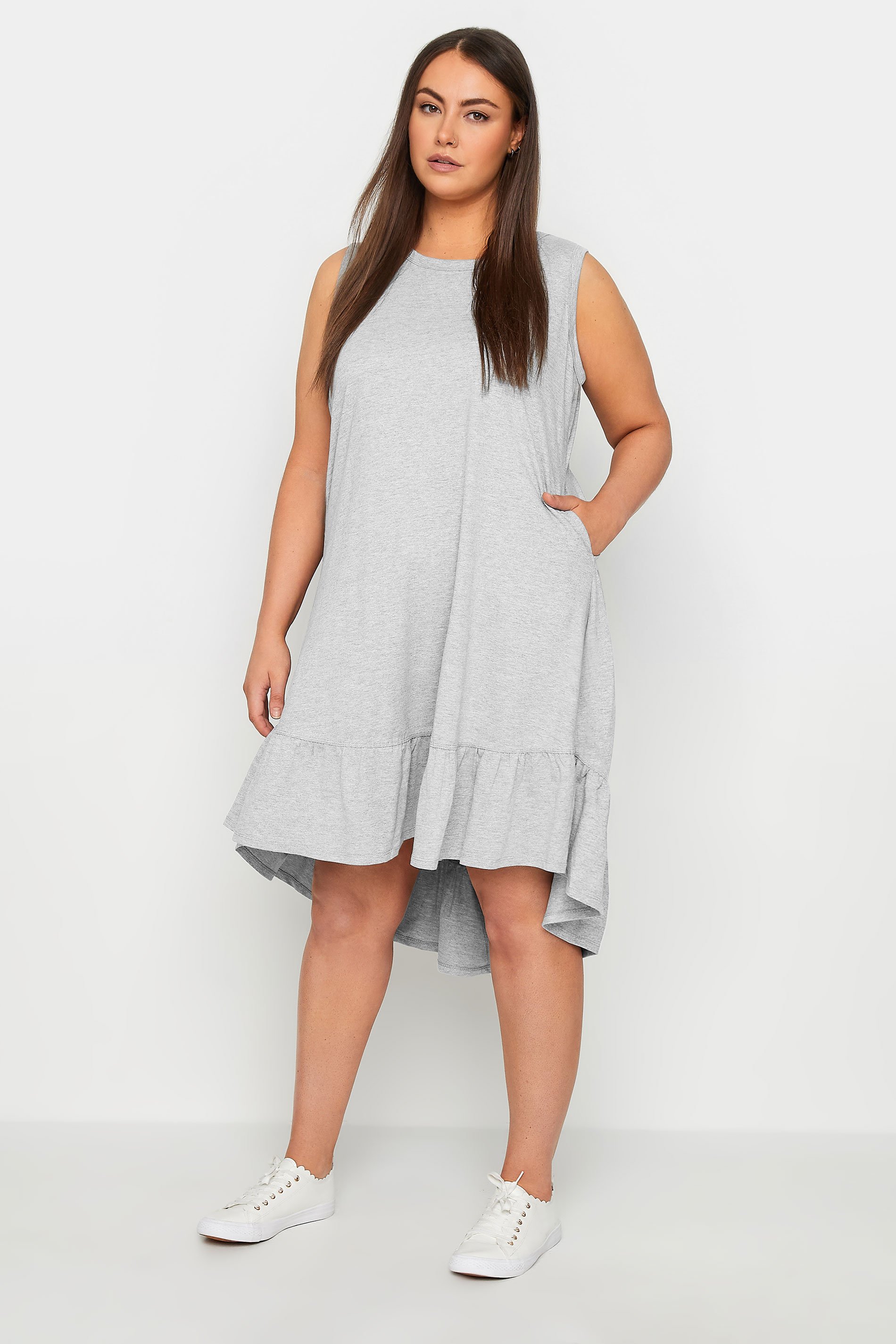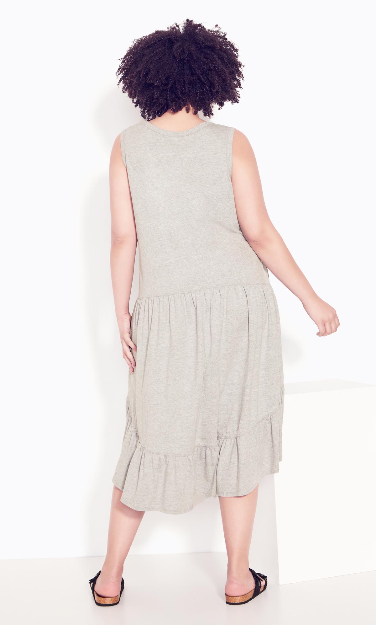 Elevate your style with the Avenue Grey Sleeveless Dipped Smock Hem Midi Dress. Crafted for comfort and elegance, this dress features a versatile grey hue that's perfect for various occasions. The sleeveless design and dipped smock hem add contemporary flair to the classic midi dress silhouette, making it a go-to choice for both casual outings and more sophisticated events. Embrace a look that effortlessly blends comfort and fashion with this must-have piece from Avenue.