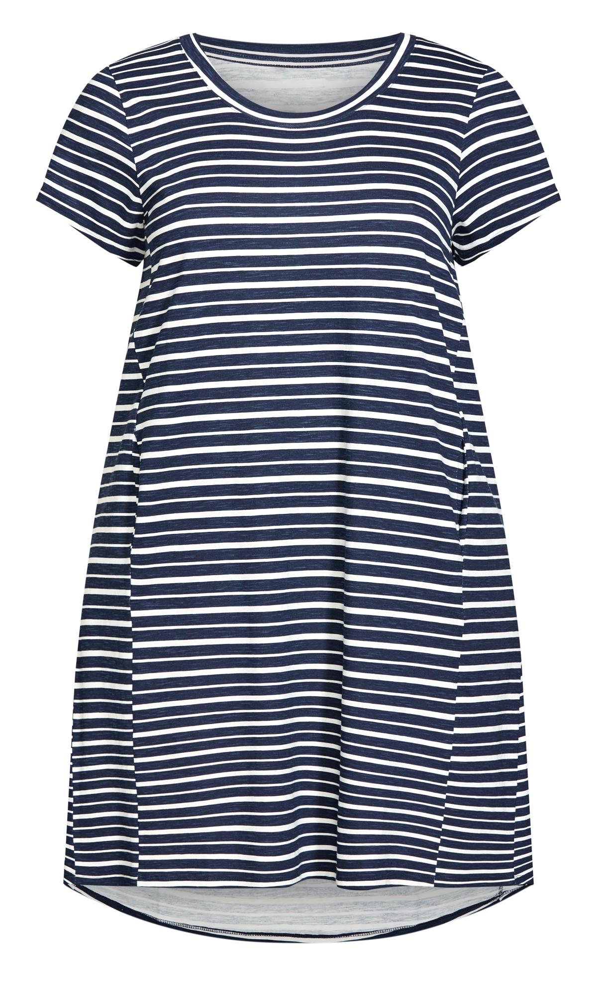 Elevate your style with the Zim & Zoe Navy Blue Stripe Pocket Midi Dress. Classic navy stripes and convenient pockets create a blend of fashion and function. Whether it's city adventures or casual outings, this midi dress is your perfect companion.