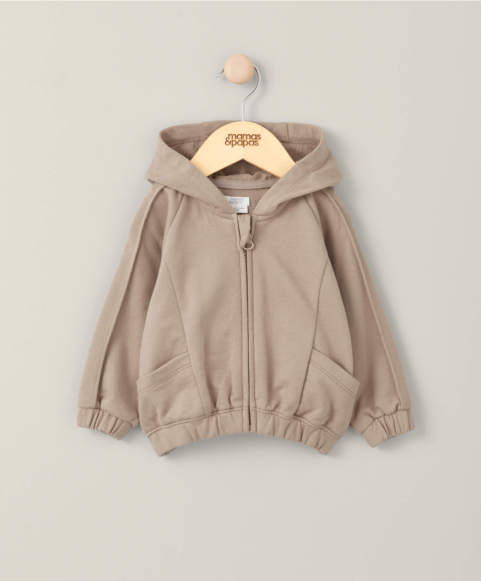 Boys' long-sleeved loopback sweat hoodie, in Taupe. With zip fastening at front, for easy dressing and undressing. Pocket detail. In ultrasoft stretchy jersey fabric. Matches perfectly with our taupe joggers.